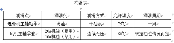 在日常運行中,應(yīng)保證各潤滑點充分潤滑,并定期對粉分離器內(nèi)軸承和風機軸承進行潤滑(見下表)。在日常維護中,注意粉體分離器轉(zhuǎn)子的平衡。如發(fā)現(xiàn)異常振動,應(yīng)立即停機檢查原因,并可在運行前繼續(xù)故障。