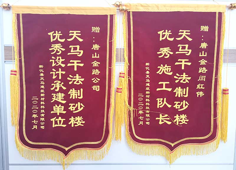 近日,天馬建筑項(xiàng)目負(fù)責(zé)人將兩面印有“天馬干法制砂樓,優(yōu)秀設(shè)計(jì)承建單位”、“天馬干法制砂樓,優(yōu)秀施工隊(duì)長”的錦旗送到了唐山金路安裝隊(duì)長閆紅偉的手上。